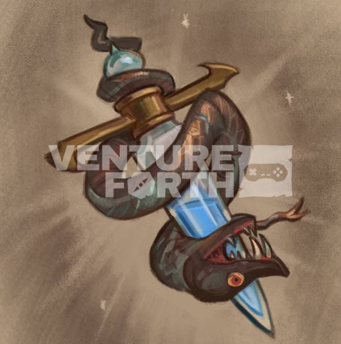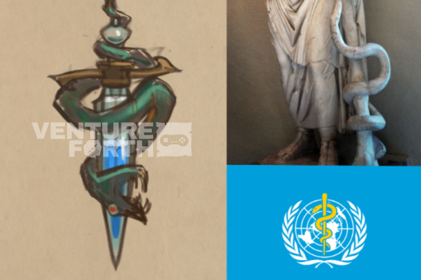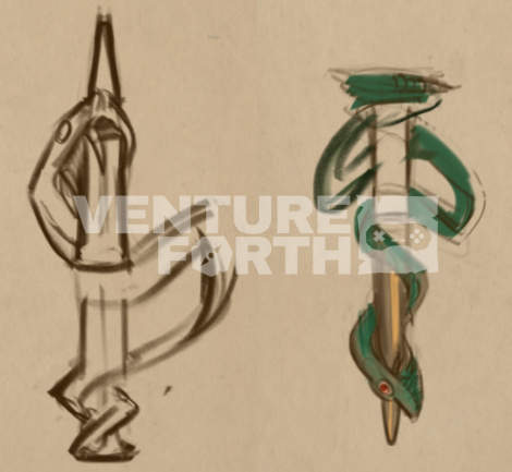 This being game art, of course, it’s good to really find the obvious and have fun with it – the snake with its head speared in a state of defeat being more on the nose and aesthetically cool.