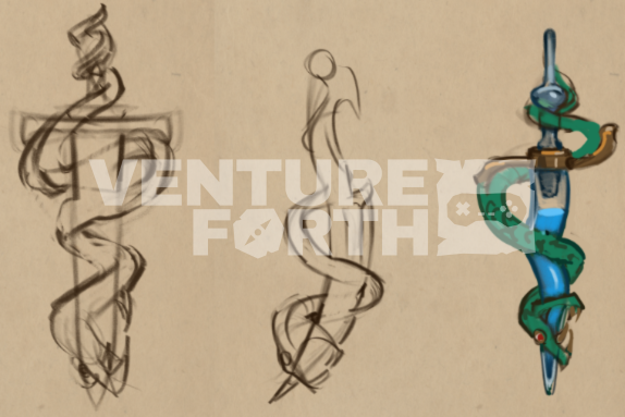This design (above) keeps the asymmetry of the crossguard and the now thicker and more appealing coiling snake, but creates a stronger juxtaposition of shapes with a more obviously blade shaped vial.