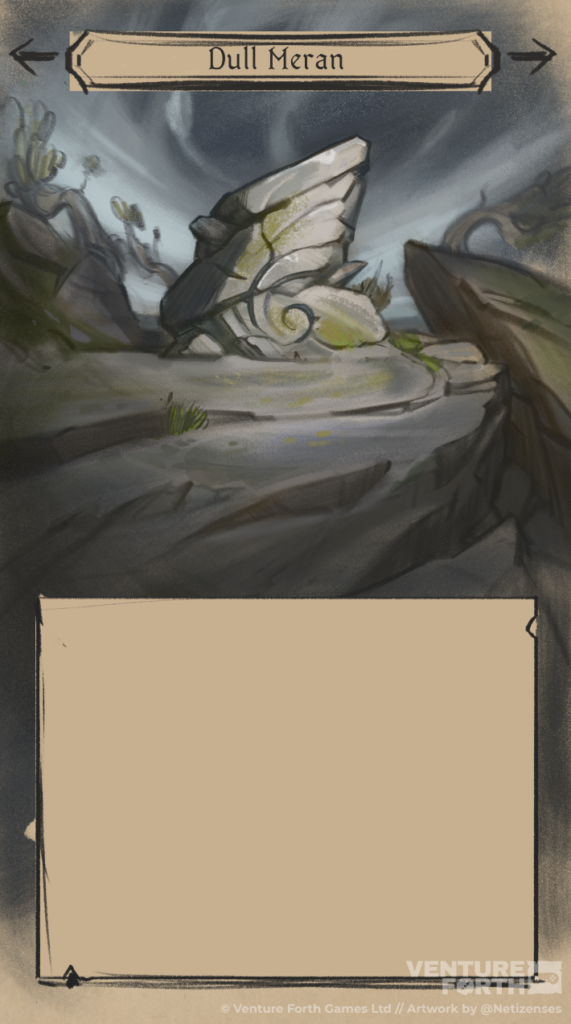 Back on track, all I needed to do now was give this place a name. I’m using Old and Middle English words as the foundation for inventing new words and phrases, so the words ‘duelle’ (duel) and ‘mymerian’ (remember) become a geographic point of interest called ‘Dull Meran’.